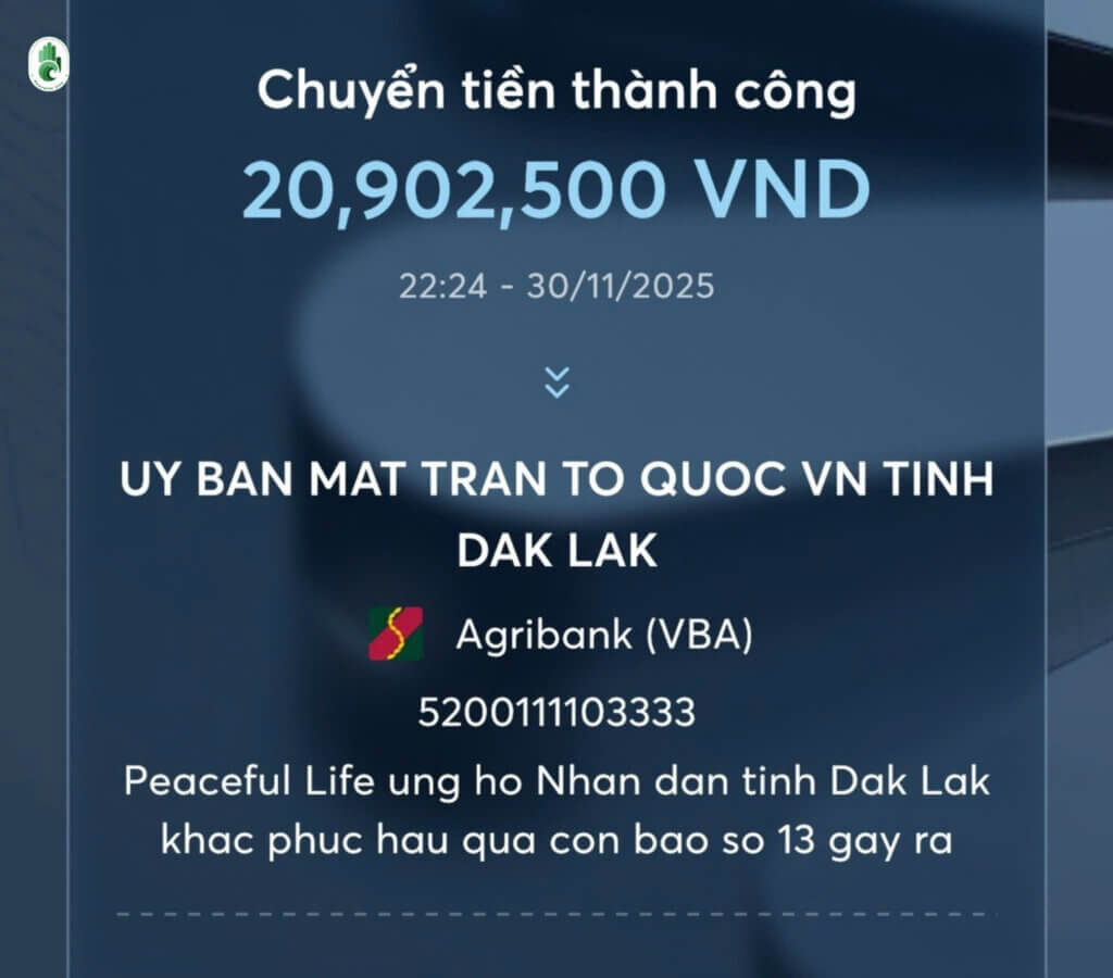 – Ủng hộ nạn nhân lũ lụt thông qua UBMTTQVN Tỉnh Đăk Lăk: 20.902.500 VNĐ